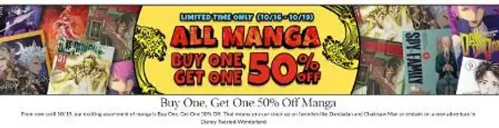 Don't miss out! Shop in store and get all manga for buy one, get one 50% off.