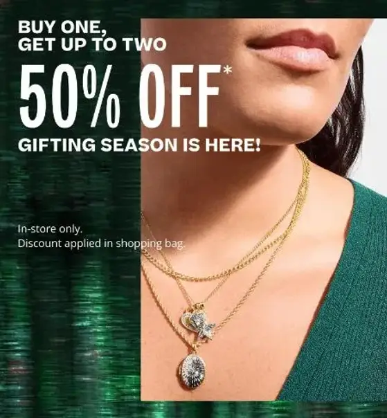 * Buy One, Get Up to Two 50% off valid in stores from October 31, 2025 through November 2, 2025. Second and third items purchased must be of equal or lesser value than the original item. Sale excludes piercing earrings, special offers, gift cards, prior purchases, extended service agreements, service fees, charitable items and donations. Cannot be combined with any other offer. Offer may exclude certain items. Promotions, pricing, styles and availability may vary by store and online. Please see Jewelry expert for details.