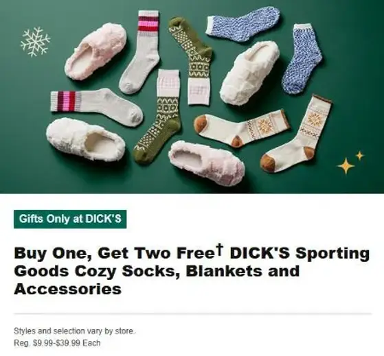 Better hurry! Shop in store and enjoy buy one, get two free DICK'S Sporting Goods cozy socks, blankets, and accessories.