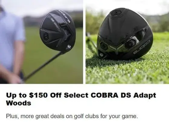 Save big now! Shop in store and get up to $150 off select COBRA DS Adapt Woods. Plus, more great deals on golf clubs for your game.